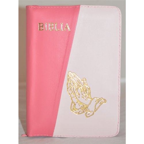 Biblie din piele, mica, roz / roz deschis, fermoar, margini albe, simbolul maini in ruga, cuv. lui Isus in rosu [043 PF]