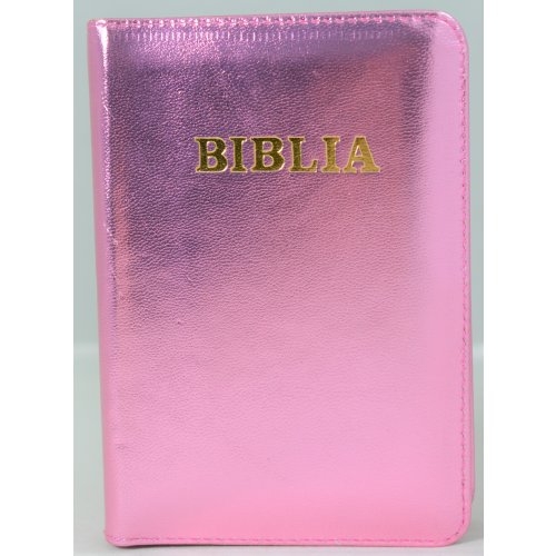 Biblie din piele, mica, roz sidefat, fermoar, margini albe, cuv. lui Isus in rosu [043 PF]