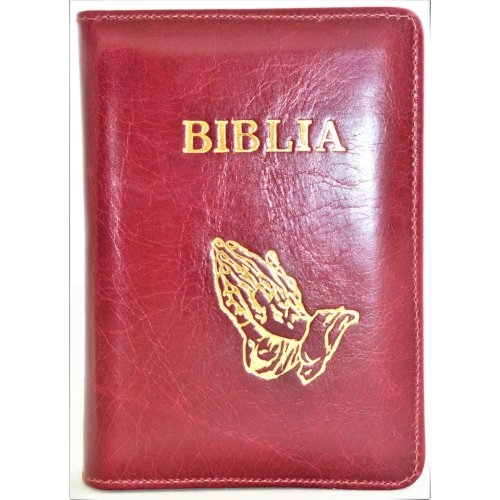 Biblie din piele, mica, visiniu marmorat, fermoar, margini albe, simbolul maini in ruga, cuv. lui Isus in rosu [043 PF]