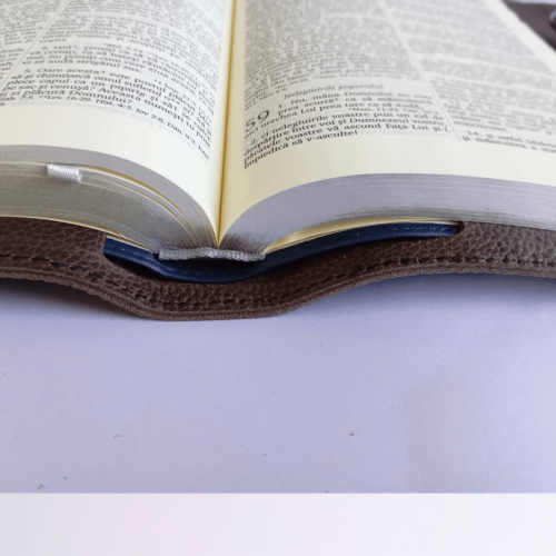Biblie în husă, marime mare, piele, maro, cu clapetă și capse, index, margini argintii, cuv. Isus cu rosu + inel pentru pix [SI 073 CLA]