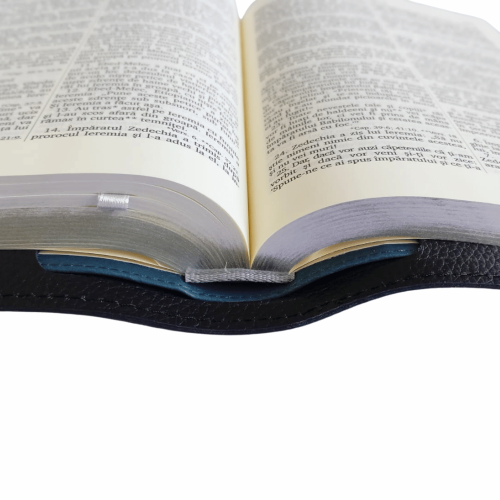 Biblie în husă, marime mare, piele, neagră, cu clapetă și capse, index, margini argintii, cuv. Isus cu rosu + inel pentru pix [SI 073 CLA]