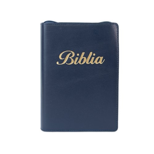 Biblie mare, piele, bleumarin, fermoar, index, margini argintii, cuv. Isus cu rosu + inel pentru pix [MAR 073 PFI]