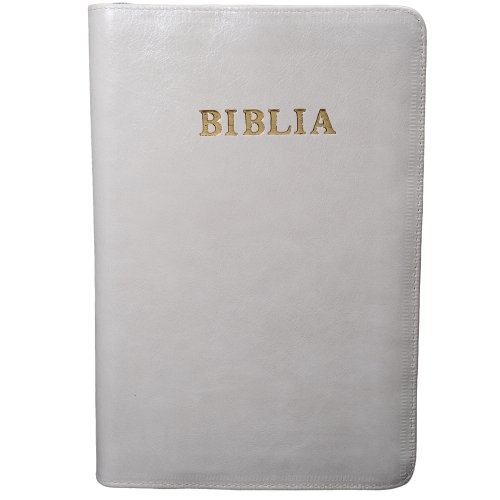 Biblie mare, piele, culoare alb murdar, fermoar, index, margini argintii, cuv. Isus cu rosu [SI 073 PFI]