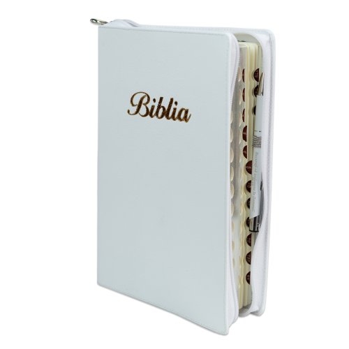 Biblie mare, piele, culoare alba, fermoar, index, margini argintii, cuv. Isus cu rosu + inel pentru pix [MAR 073 PFI]