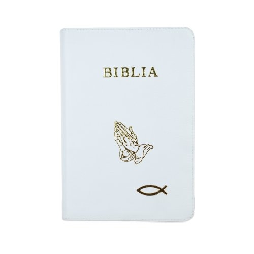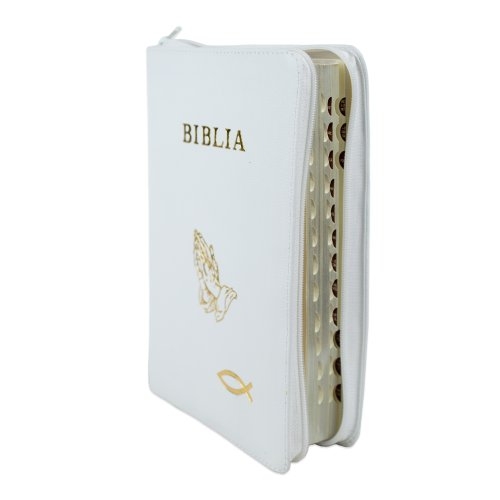 Biblie mare, piele, culoare albă, fermoar, index, margini argintii, simbol mâini în rugăciune, cuv. Isus cu rosu [SI 073 PFI]