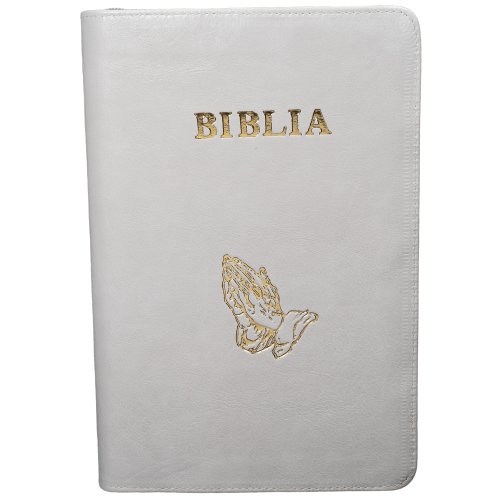 Biblie mare, piele, culoare alb murdar, fermoar, index, margini argintii, simbol mâini în rugăciune, cuv. Isus cu rosu [SI 073 PFI]