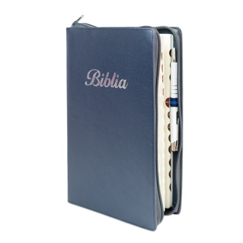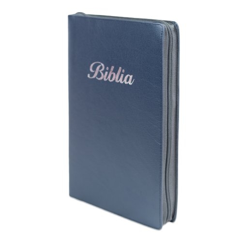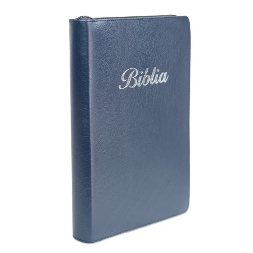Biblie mare, piele, culoare bleumarin, fermoar, index, margini argintii, cuv. Isus cu rosu + inel pentru pix [MAR 073 PFI]