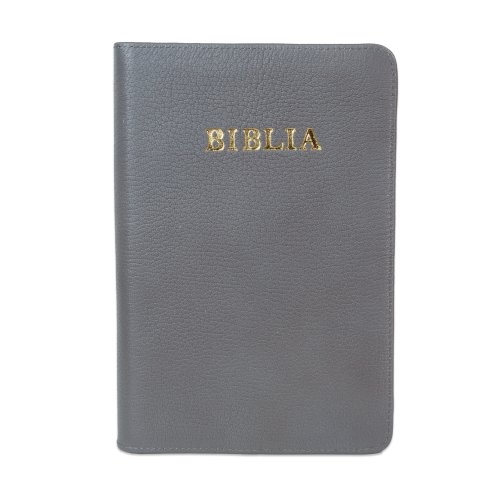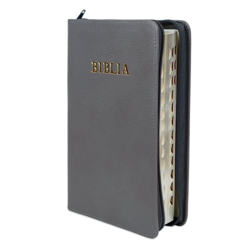 Biblie mare, piele, culoare gri deschis texturat, fermoar, index, margini argintii, cuv. Isus cu rosu [SI 073 PFI]