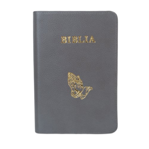 Biblie mare, piele, culoare gri deschis texturat, fermoar, index, margini argintii, simbol mâini în rugăciune, cuv. Isus cu rosu [SI 073 PFI]