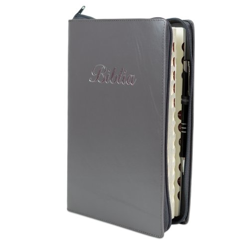 Biblie mare, piele, culoare gri, fermoar, index, margini argintii, cuv. Isus cu rosu + inel pentru pix [MAR 073 PFI]