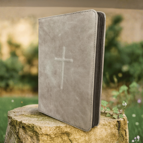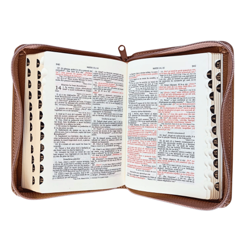 Biblie mare, piele, culoare gri, fermoar, index, margini aurii simbol cruce gravata, cuv. lui Isus cu rosu [SI 073 PFI]