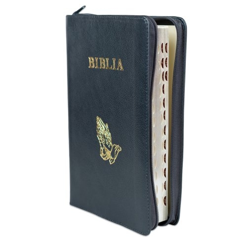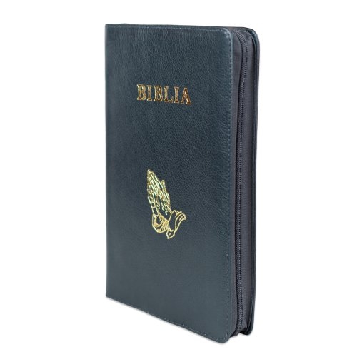 Biblie mare, piele, culoare gri închis texturat, fermoar, index, margini argintii, simbol mâini în rugăciune, cuv. Isus cu rosu [SI 073 PFI]
