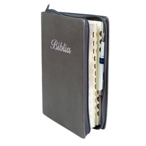 Biblie mare, piele, culoare gri texturat, fermoar, index, margini argintii, cuv. Isus cu rosu + inel pentru pix [MAR 073 PFI]
