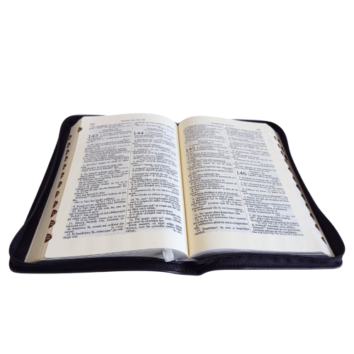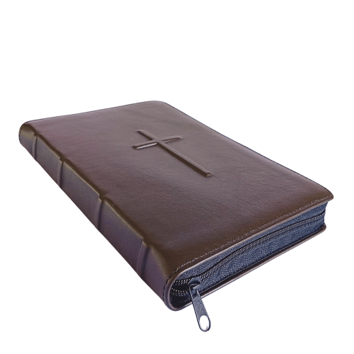 Biblie mare, piele, culoare maro închis, fermoar, index, margini argintii, simbol cruce, cuv. Isus cu rosu [SI 073 PFI]