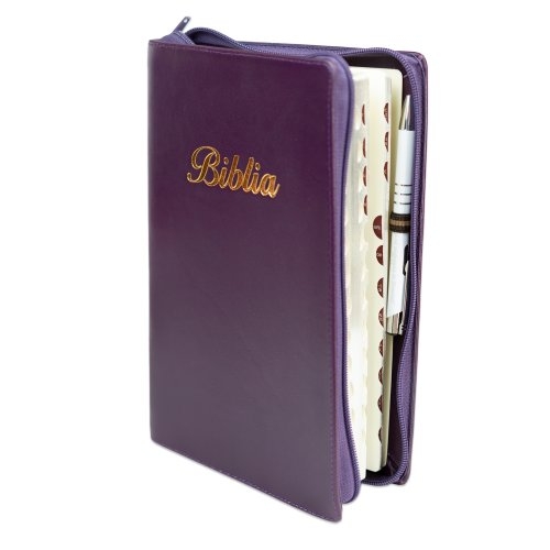 Biblie mare, piele, culoare mov, fermoar, index, margini argintii, cuv. Isus cu rosu + inel pentru pix [MAR 073 PFI]
