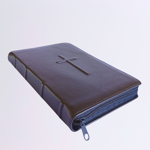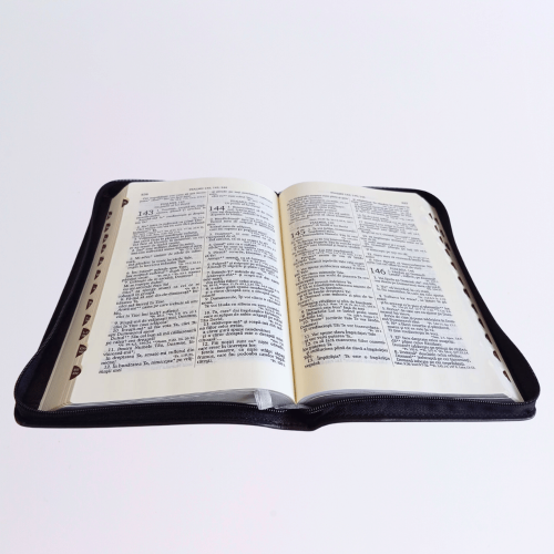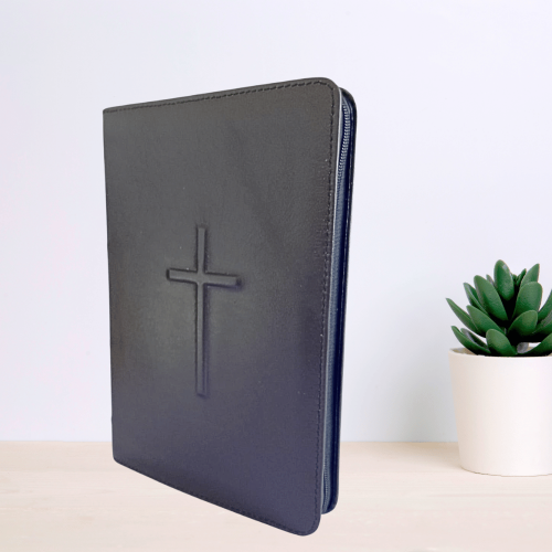 Biblie mare, piele, culoare neagră, fermoar, index, margini argintii, simbol cruce, cuv. Isus cu rosu [SI 073 PFI]