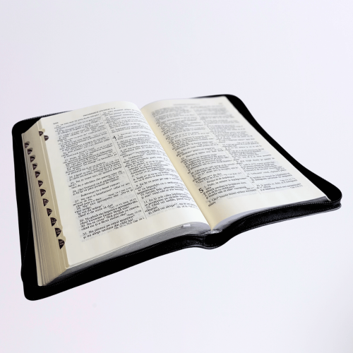 Biblie mare, piele, culoare neagră, fermoar, index, margini argintii, simbol cruce, cuv. Isus cu rosu [SI 073 PFI]