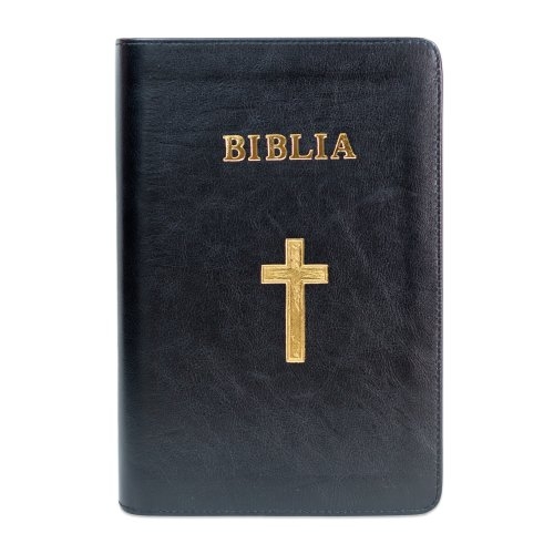 Biblie mare, piele, culoare neagră, fermoar, index, margini aurii, simbol cruce, cuv. Isus cu rosu [SI 073 PFI]