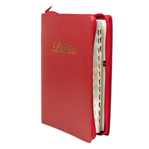 Biblie mare, piele, culoare rosie, fermoar, index, margini argintii, cuv. Isus cu rosu + inel pentru pix [MAR 073 PFI]