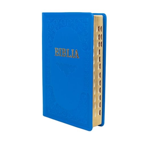 Biblie mare, piele, handmade, albastru deschis, index, margini aurii, cuv. Isus cu rosu [SI 076 HM]