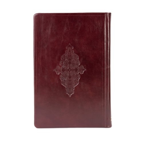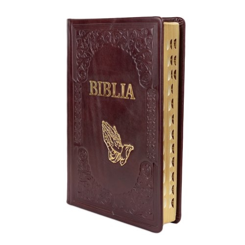 Biblie mare, piele, handmade, bordo inchis, simbol mâini în rugăciune, index, margini aurii, cuv. Isus cu rosu [SI 076 HM]