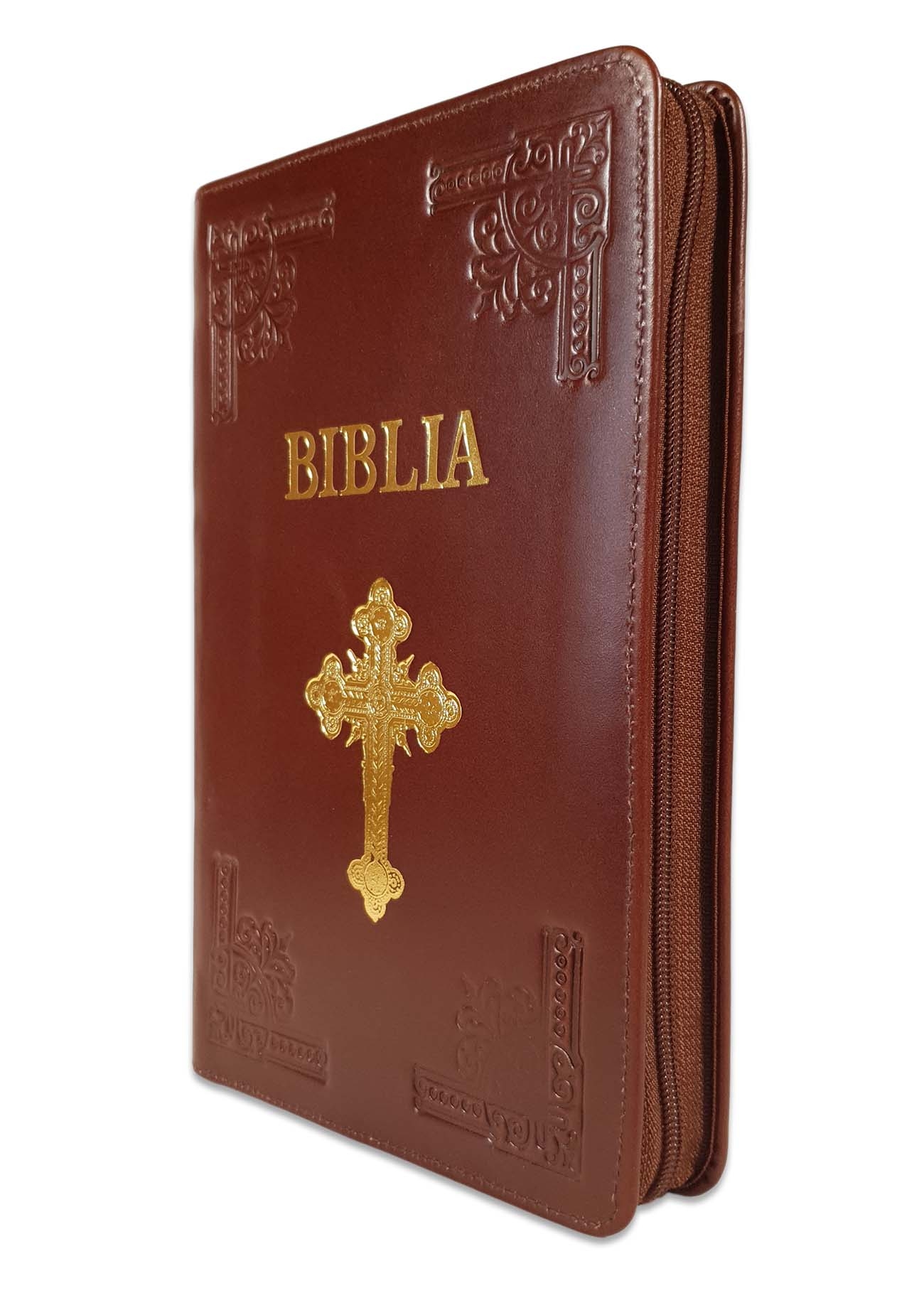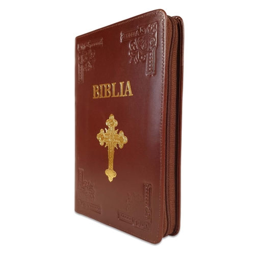 Biblie mare, piele, handmade, culoare maro inchis, fermoar, index, margini argintii, simbol cruce, cuv. Isus cu rosu [SI 076 HM]
