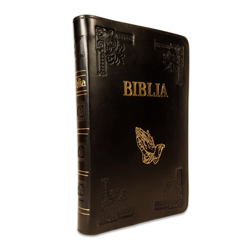 Biblie mare, piele, handmade, culoare neagra, fermoar, index, margini argintii, simbol maini in rugaciune, cuv. Isus cu rosu [SI 076 HM]