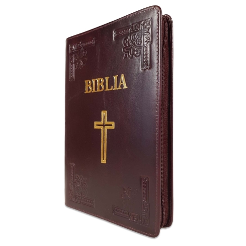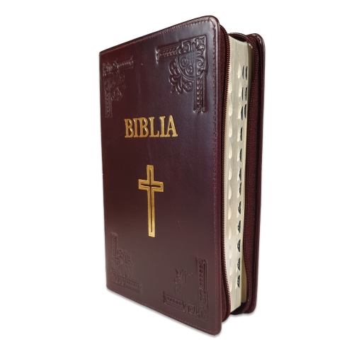 Biblie mare, piele, handmade, culoare visiniu inchis, fermoar, index, margini argintii, simbol cruce, cuv. Isus cu rosu [SI 076 HM]