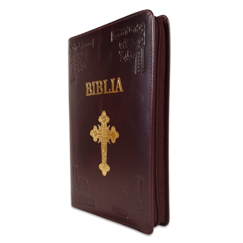 Biblie mare, piele, handmade, culoare visiniu inchis, fermoar, index, margini argintii, simbol cruce, cuv. Isus cu rosu [SI 076 HM]