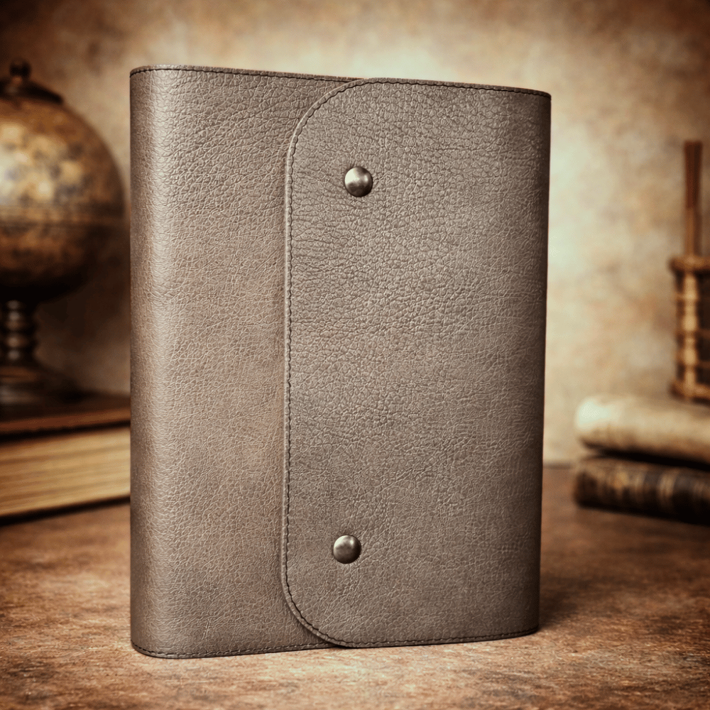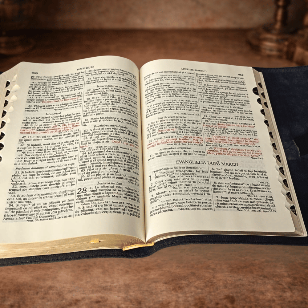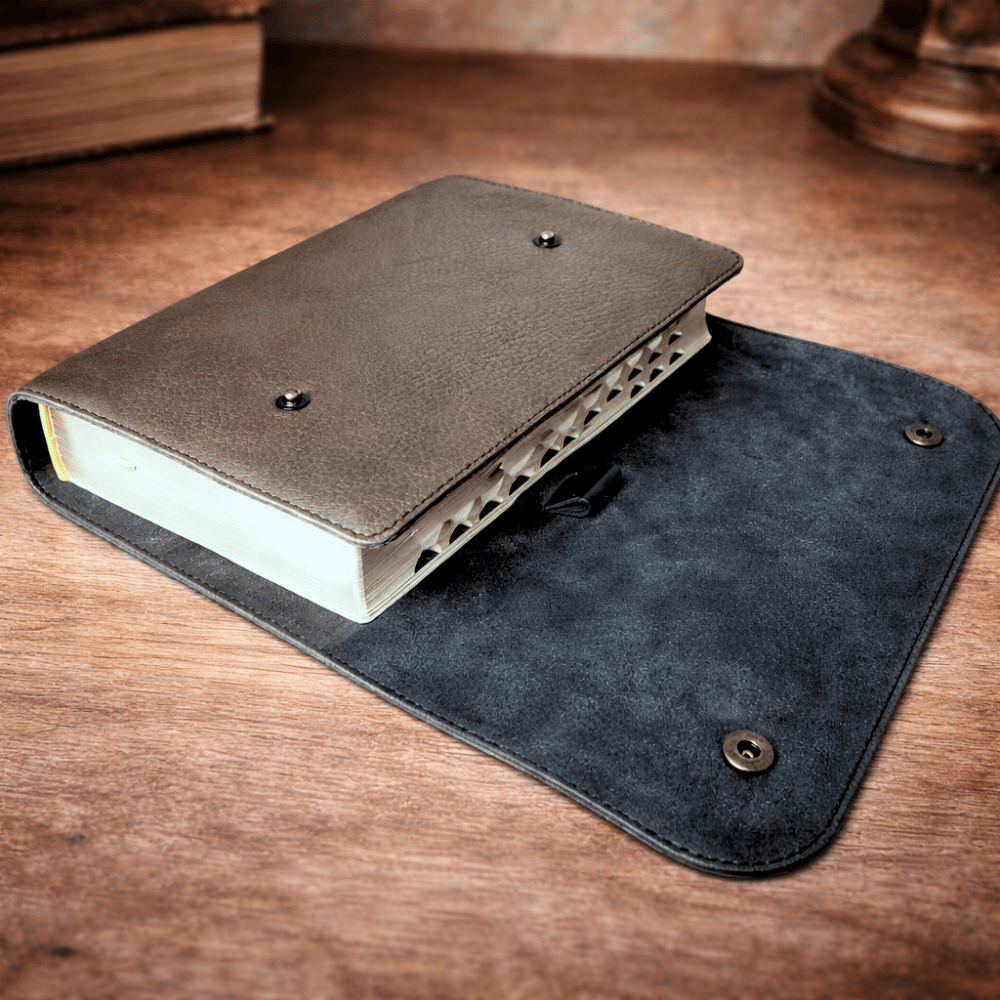Biblie mare, piele, maro kaki, cu clapetă și capse, index, margini aurii, cuv. Isus cu rosu + inel pentru pix [SI 073 CLA]