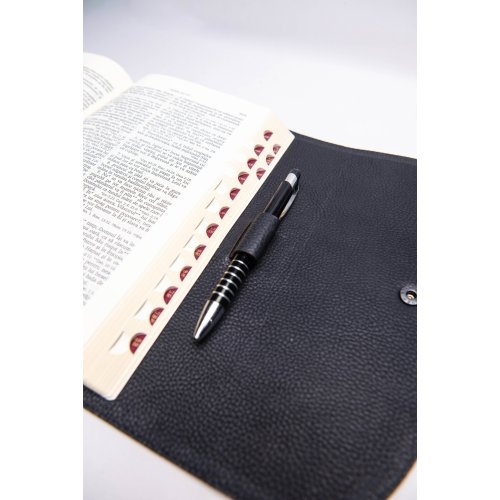Biblie mare, piele, neagră, cu clapetă și capsă, index, margini argintii, cuv. Isus cu rosu [SI 073 CLA]