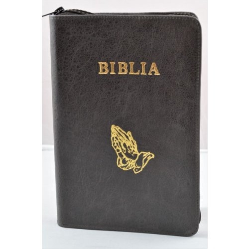 Biblie mare, piele, culoare nuanta de maro, fermoar, index, margini argintii, simbol maini in ruga, cuv. Isus cu rosu [SI 073 PFI]