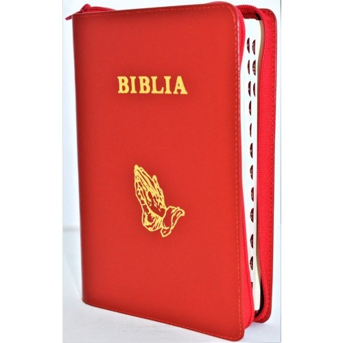 Biblie mare, piele, rosie, fermoar, index, margini argintii, simbol maini in ruga, cuv. Isus cu rosu [SI 073 PFI]