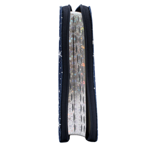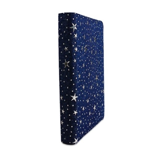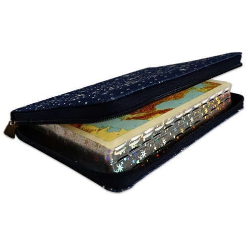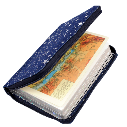 Biblie marime medie, material textil jeans, bleumarin, fermoar, index, margini argintii cu stelute, hărți biblice [055 JZB TI]