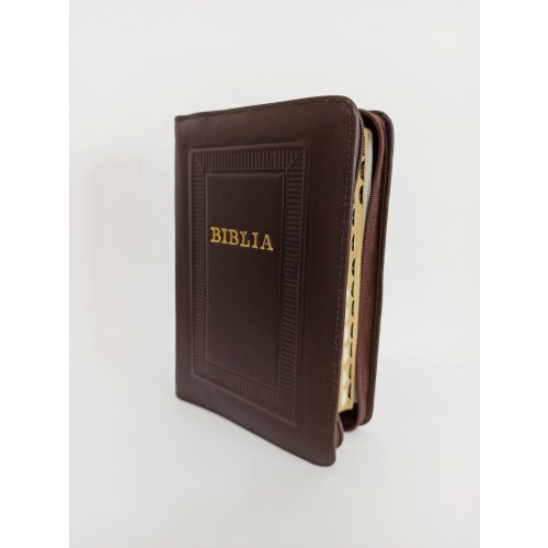 Biblie marime mica, piele, hand made, culoare maro brun , index, fermoar, margini aurii, cuv. lui Isus cu rosu [047 HM]