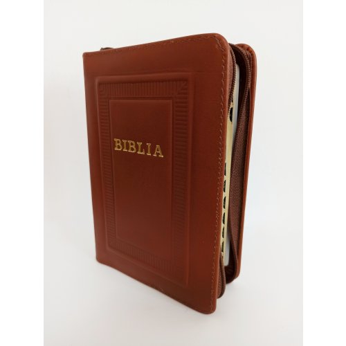 Biblie marime mica, piele, hand made, culoare maro , index, fermoar, margini aurii, cuv. lui Isus cu rosu [047 HM]