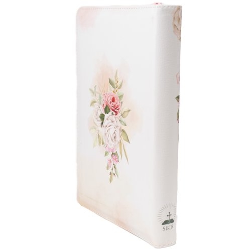 Biblie personalizată cu numele Maria - Biblie marime medie, piele ecologică, model floral alb, fermoar, index, margini aurii, cuv. lui Isus cu rosu [057 F]
