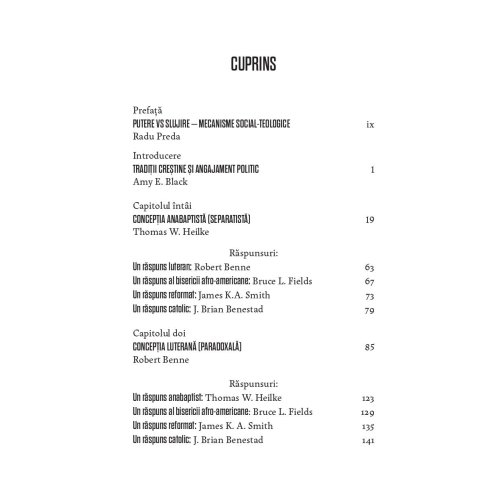 O carte pe care orice creștin ar trebui să o citească și să o recitească înaintea fiecărui exercițiu electoral. Perspectivele incluse demonstrează că nu există o singură atitudine validă a creștinului față de politică – doar aici avem 5 și premise pentru o a șasea! Dar și că este nevoie de un efort teologic serios pentru a articula o perspectivă coerentă și suficient de complexă încât să acopere marile teme precum: relația cu puterea politică; atitudinea față de cei marginalizați; modul în care sunt înțelese dreptatea și legile civile sau penale; virtuțile civice etc.