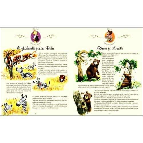 Bunico, spune-ne o poveste! o roagă cei doisprezece ursuleţi pe ursoaica cea bătrână, bunica lor. Și, cum unor ursuleţi cum sunt ei li se potrivesc cel mai bine istorioarele cu animale sălbatice, bunica-ursoaică le istorisește întâmplări cu prietenii ei, animale sălbatice pe care le cunoscuse cu mulţi ani în urmă, pe vremea când fusese și ea tânără și în puteri și bătuse pământul în lung și-n lat.Întâmplări cu Tippy, cimpanzeul cel zvăpăiat, cu Crocolino, crocodilașul căruia nu-i prea plăcea să-și curete dinţii, cu Tobias, elefantul cel isteţ, care i-a încropit soţiei un umbrar, cu Rafaela, girafa cea vorbăreaţă, care nu-și ţinea niciodată gura, cu Pin, pinguinul cel curios de la Polul Sud, cu Tilly, cel mai fricos tigrișor din toată jungla, cu Bela, zebra cea cu părul strălucitor și coama bine pieptănată, care și-ar fi dorit alte veșminte, cu Bruno, namila de urs care se dădea în vânt după miere, cu fraţii Leonard și Leopold, puii de leu cei încăpăţânaţi și care nu făceau niciodată ce le spunea mama lor, cu Karl, puiul de cangur cel sfios, care stătea tot timpul cuibărit în marsupiul mamei, cu Pilu, pelicanul cel alb și cu pliscul uriaș, în care avea prostul obicei să ascundă tot ceea ce șterpelea de la alte animale, cu Hippy, micul hipopotam dolofan și leneș...Douăsprezece povești pentru tot atâţia ursuleţi sau copilași, mai cuminţi sau mai neastâmpăraţi, după cum se nimerește, fiecare cu povaţa ei, fiecare cu o învăţătură!