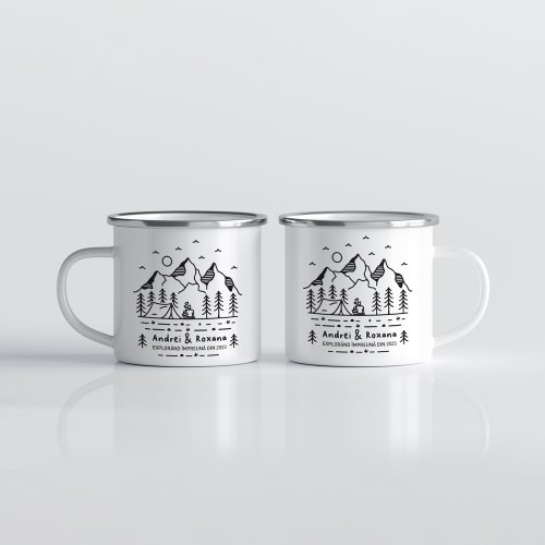 Cană metalică emailată personalizată cu două nume si text – Călătorie in doi