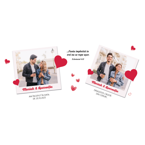 Fiecare cana personalizată cu poza și data este realizată cu grijă, iar detaliile personalizate, inclusiv un nume, fac din acest cadou o alegere perfectă pentru cei care doresc să își exprime dragostea într-un mod special. Adaugă un verset la alegere care să simbolizeze relația voastră și să transmită un mesaj de binecuvântare și apreciere.