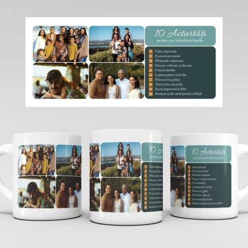Cu posibilitatea de a personaliza cana cu 4 poze reprezentând cele mai frumoase amintiri petrecute în familie și o listă de activități preferate, vei crea un suvenir autentic și unic. Fie că o oferi ca un cadou pentru ocazii speciale sau pentru a marca aniversarea unei zile de familie, cana personalizată cu poze și activități va fi cu siguranță un cadou apreciat de toți membrii familiei.