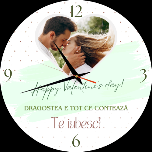 Îți dorești un cadou cu totul special pentru Valentine’s Day? Surprinde persoana iubită cu un ceas personalizat care îmbină dragostea și amintirile prețioase. Acest ceas de perete personalizat patrat este alegerea perfectă pentru a celebra dragostea voastră, fiind decorat cu o fotografie semnificativă și cu mesajul emoționant „Dragostea e tot ce contează. Te iubesc”. Un cadou ideal pentru Ziua Îndrăgostiților, acest ceas personalizat pentru Valentine’s Day va aduce zâmbetul pe buzele celui drag de fiecare dată când îl va privi.