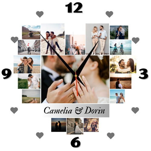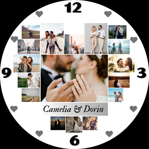 Ceas pentru cuplu, personalizat cu 17 poze și două nume