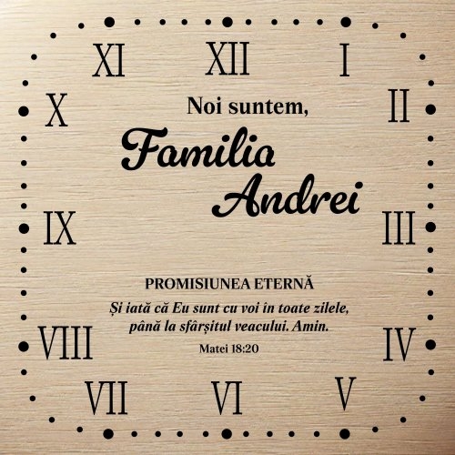 La Librăria Maranatha, vă oferim un ceas personalizat special conceput pentru a aduce o notă de eleganță și semnificație în casa ta. Acest ceas personalizat de perete este mai mult decât un simplu accesoriu decorativ – poate fi personalizat cu un verset biblic sau numele de familie, devenind o adevărată declarație de credință și iubire.