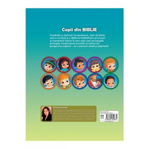 Presărată cu ilustrații fermecătoare, cartea Copii din Biblie este o invitație la o călătorie încântătoare prin locuri și evenimente biblice în care copiii sunt personajele principale. Povestioarele prezintă Scriptura din perspectiva copilului - ca o aventură veselă și palpitantă.