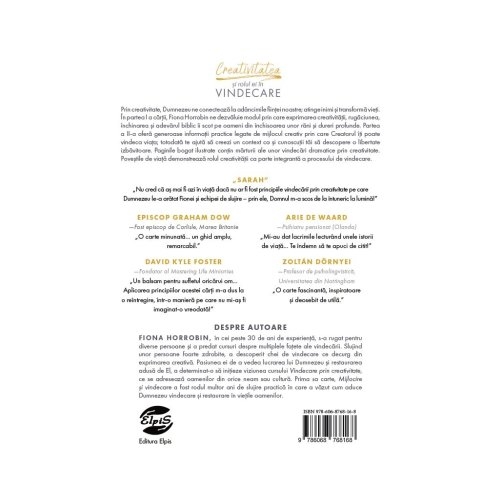 Cineva a spus odată că distanța cea mai lungă din viață este cea de la minte la inimă! Creativitatea și rolul ei în vindecare vă va ajuta să vă reconectați la Dumnezeu. Vă va purta într-o călătorie de vindecare și descoperire, va fi un balsam pentru sufletul oricărui om care se confruntă cu o profundă zdrobire și cu o viață bazată pe performanță. Aplicarea principiilor acestei cărți m-a dus la o reîntregire într-o manieră pe care nu mi-aș fi imaginat-o vreodată!