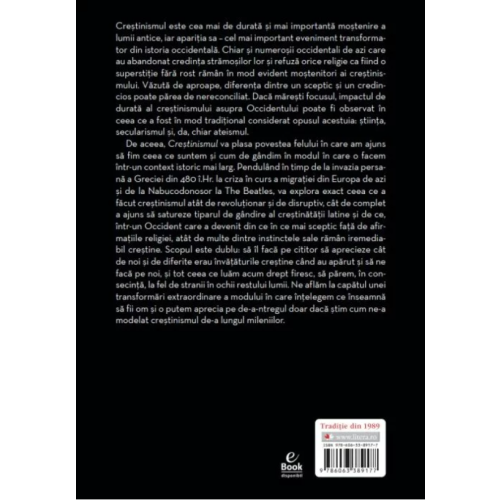 Creștinismul este cea mai de durată și mai importantă moștenire a lumii antice, iar apariția sa – cel mai important eveniment transformator din istoria occidentală. Chiar și numeroșii occidentali de azi care au abandonat credința strămoșilor lor și refuză orice religie ca fiind o superstiție fără rost rămân în mod evident moștenitori ai creștinismului. Văzută de aproape, diferența dintre un sceptic și un credincios poate părea de nereconciliat. Dacă mărești focusul, impactul de durată al creștinismului asupra Occidentului poate fi observat în ceea ce a fost în mod tradițional considerat opusul acestuia: știința, secularismul și, da, chiar ateismul. De aceea, Creștinismul va plasa povestea felului în care am ajuns să fim ceea ce suntem și cum de gândim în modul în care o facem într-un context istoric mai larg. Pendulând în timp de la invazia persană a Greciei din 480 î.Hr. la criza în curs a migrației din Europa de azi și de la Nabucodonosor la The Beatles, va explora exact ceea ce a făcut creștinismul atât de revoluționar și de disruptiv, cât de complet a ajuns să satureze tiparul de gândire al creștinătății latine și de ce, într-un Occident care a devenit din ce în ce mai sceptic față de afirmațiile religiei, atât de multe dintre instinctele sale rămân iremediabil creștine. Scopul este dublu: să îl facă pe cititor să aprecieze cât de noi și de diferite erau învățăturile creștine când au apărut și să ne facă pe noi, și tot ceea ce luăm acum drept firesc, să părem, în consecință, la fel de stranii în ochii restului lumii. Ne aflăm la capătul unei transformări extraordinare a modului în care înțelegem ce înseamnă să fii om și o putem aprecia pe de-a-ntregul doar dacă știm cum ne-a modelat creștinismul de-a lungul mileniilor.