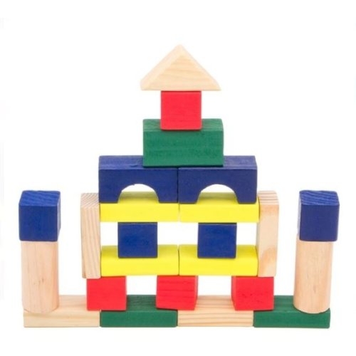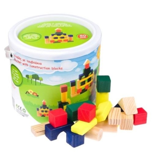 Cuburi de construit din lemn in galeata , multicolore, 50 de piese