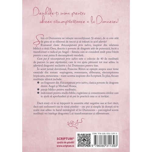Daca ti-ai pus vreodata problema daca Dumnezeu te iubeste cu adevarat, parcurgand acest jurnal (si romanul Rascumparata prin iubire, daca nu l-ai citit pana acum), vei ajunge sa intelegi dragostea rascumparatoare a lui Dumnezeu – genul de iubire neconditionata care lupta pentru a ne salva si este dispusa sa ne primeasca acasa, indiferent cat de departe am ratacit!